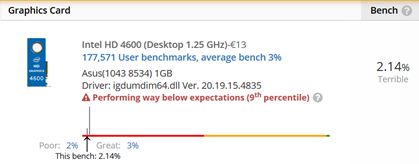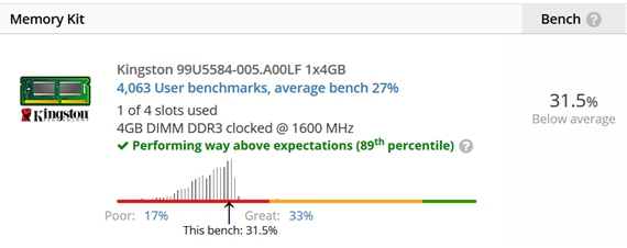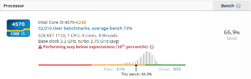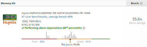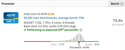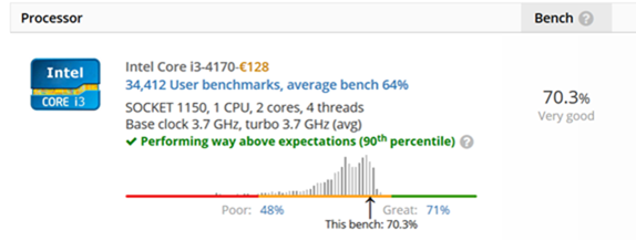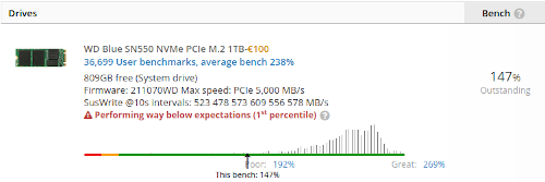 I downloaded and installed a benchmark tool called UserBenchmark. It is very easy to use. With one click you launch a set of tests and after some minutes you get a result summary which is stored and compared to other results into a worldwide amazing database. Moreover, the motherboard, the BIOS as well as other main components are identified. It is possible to navigate in the database to get the results for the same components in other configurations or to compare them with the competitors.