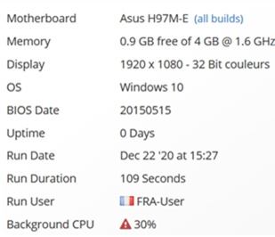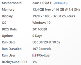 BIOS update: the report of UserBenchmark identifies the motherboard (Asus H97M-E) and the BIOS version (20150515). On Asus web site, we can see that there exist newer BIOS releases. I copied the latest available on this day (https://www.asus.com/FR/supportonly/H97M-E/HelpDesk_BIOS/) on a USB key and reflashed the BIOS from it.