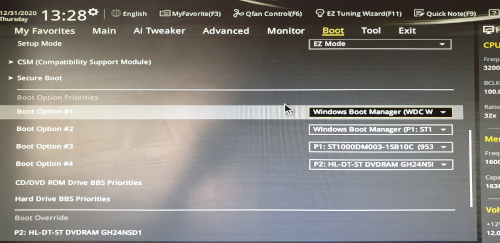 Modification of the boot order in the BIOS to put the SSD drive in first position.